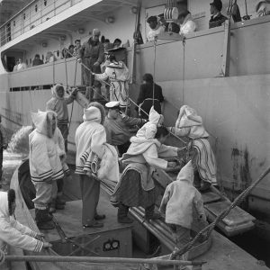 Inuit boarding the ship C.D. Howe for medical examination by the Eastern Arctic Patrol Officers in July 1951. Leah travelled to Quebec City on this boat. (Photo: WilfredDoucette/National Film Board of Canada/Library and Archives Canada/e005477084)
